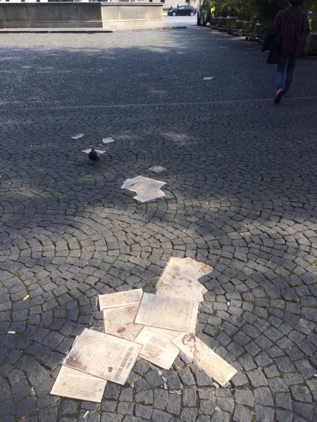 建物の外に出てよく見ると、足元にはビラのモニュメント(?)が…